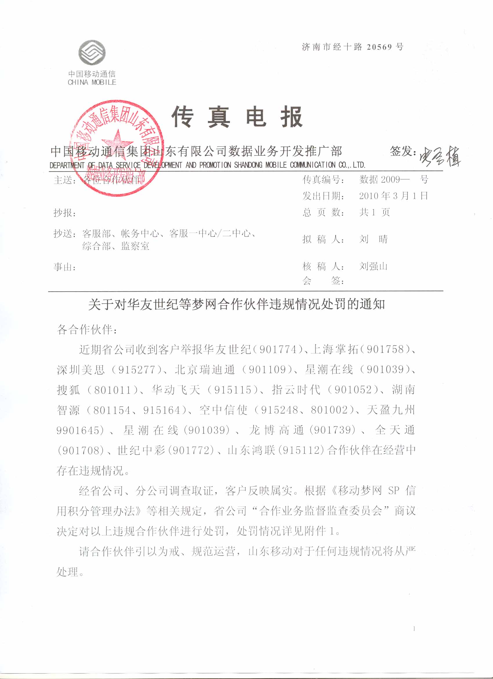 | 5 | 星潮在線 | 901039 | 10665366 | 該公司“拇指互動”業(yè)務,存在未經許可隨意更改業(yè)務邏輯和內容,影響用戶正常使用和服務。 | 暫停該公司“拇指互動”業(yè)務(業(yè)務代碼:XXMZHD)在山東地區(qū)的服務1個月?鄢庞梅e分5分。 |