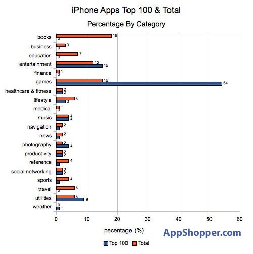 “生產(chǎn)力”軟件雖然只占軟件總數(shù)的5%,但在Top100排行榜中卻占據(jù)了19%;“游戲”仍然居第一位,無論是在軟件總數(shù)比例(25%)還是在Top100排行榜中的比例(29%),但兩者的比率相對(duì)均衡。