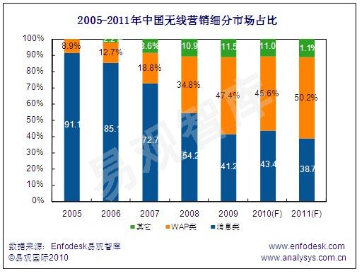 根據(jù)Enfodesk易觀智庫近期發(fā)布《中國無線營銷市場專題報(bào)告2010》顯示, 2009年中國無線營銷市場WAP類廣告在無線營銷整體占比達(dá)47.4%,其規(guī)模同比增長76.8%,與消息類廣告同比下跌1.3%相比WAP類廣告,已成為無線營銷市場最大推動(dòng)力量。
