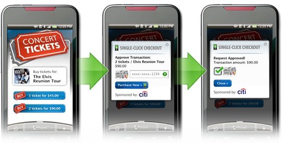 北京時間11月10日消息,據(jù)國外媒體報道,花旗銀行支持的Single-Click Checkout(singleclickcheckout.com)服務今天在舊金山的開放移動峰會(Open Mobile Summit)上推出,它是第一個為Android設計的信用卡結帳應用程序。使用這項新服務,商家可以接受來自任何移動用戶的信用卡付款。
