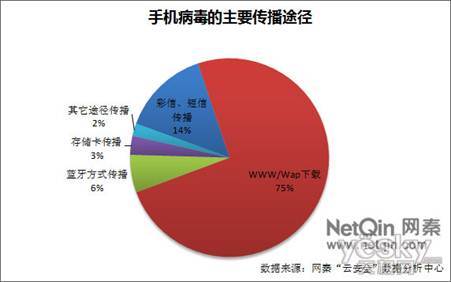 感染途徑方面,《2010年中國大陸地區(qū)手機安全報告》指出,據(jù)網(wǎng)秦“云安全”數(shù)據(jù)分析中心統(tǒng)計,當(dāng)前通過手機訪問wap和www網(wǎng)站感染病毒的比率達75%;通過短信、彩信感染病毒的比率占14%;通過藍牙傳輸方式感染病毒的比率占6%;通過存儲卡等途徑感染病毒的比率占3%;另外2%的用戶則是被其它傳播途徑的病毒感染。其中聯(lián)網(wǎng)感染病毒的機率最大,成為用戶面臨的最主要威脅。