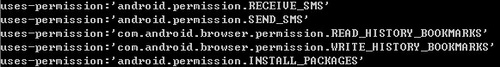 圖:增加的權限部分:加了收取和發(fā)送短信以及讀取和寫入書簽的權限