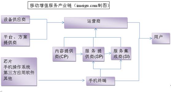 中國(guó)電信,中國(guó)移動(dòng),中國(guó)聯(lián)通是中國(guó)的三大電信運(yùn)營(yíng)商。移動(dòng)增值服務(wù)和移動(dòng)支付解決方案已構(gòu)成了移動(dòng)運(yùn)營(yíng)商的兩大收入來(lái)源。移動(dòng)增值業(yè)務(wù)是包括所有增進(jìn)移動(dòng)用戶(hù)體驗(yàn)的非話(huà)音服務(wù),在中國(guó)目前主要的四大移動(dòng)增值業(yè)務(wù)是:短信、彩信、WAP和彩鈴業(yè)務(wù)。移動(dòng)增值業(yè)務(wù)的產(chǎn)業(yè)鏈如下圖所示:
