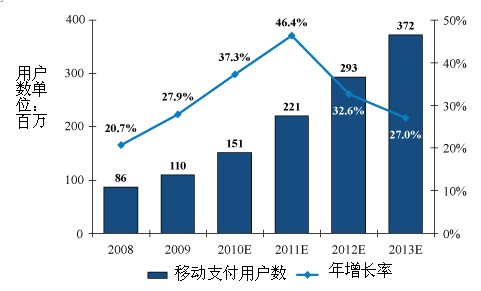 基于“中國(guó)計(jì)算機(jī)世界”的研究預(yù)測(cè),中國(guó)移動(dòng)支付用戶(hù)在2009年底達(dá)到1.1億,預(yù)計(jì)將在2013年超過(guò)3倍。由于需求大幅提高,電信運(yùn)營(yíng)商會(huì)繼續(xù)在每個(gè)省推出移動(dòng)支付解決方案網(wǎng)絡(luò)。反過(guò)來(lái),也會(huì)刺激第三方平臺(tái)和供應(yīng)商的發(fā)展。