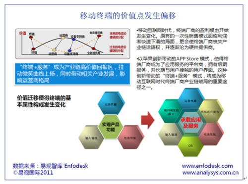 易觀智庫Enfodesk在近期發(fā)布《中國移動互聯(lián)網(wǎng)市場年度綜合報告2011》中認為,隨著3G的普及以及多元化移動應(yīng)用的出現(xiàn),智能手機取代功能手機已成定勢,導(dǎo)致傳統(tǒng)的移動終端價值點開始由產(chǎn)品化向服務(wù)化遷移。終端廠商原有模式也受到極大挑戰(zhàn)。若不進行有效轉(zhuǎn)型恐難以在未來2-3年后的手機市場生存。
