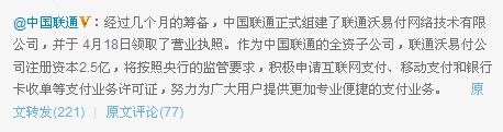 中國聯(lián)通正式組建支付公司“沃易付”