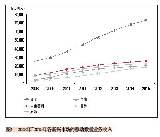 就絕對值來看亞太地區(qū)的新興市場將占主導(dǎo)地位,該地區(qū)的移動數(shù)據(jù)業(yè)務(wù)收入將從2010年的368億美元增長到2015年的734億美元,增長率幾乎為100%。給出這么高的預(yù)測值不足為奇,因為該市場上有中國、印度、印尼“三大巨頭”,這三個國家對該區(qū)域數(shù)據(jù)業(yè)務(wù)收入的貢獻將達(dá)到81%。