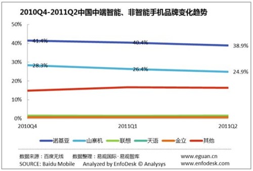 2011年Q2Android手機繼續(xù)擠占諾基亞及山寨機份額