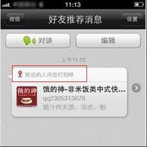 最近,網絡上流傳著這樣一幅截圖:一家叫“餓的神”的快餐店在午間向附近的人打招呼,以宣傳自己的快餐生意,乍一看這種形式,簡直是超越了空間的電子傳單啊?磥砦⑿胚@種交友利器,已經突破了傳統(tǒng)交流工具的定義,開始向更寬的領域延伸。