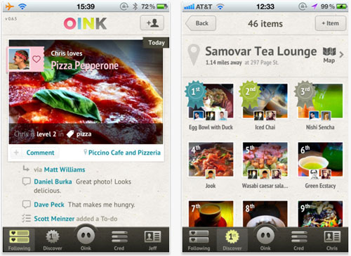 與Foursquare不同的是,Oink不是讓用戶為整個(gè)店評(píng)分,而是具體到店里的每一樣?xùn)|西。以比薩餅為例,附近有那些店提供,哪家的得分更高,哪位用戶在這方面的推薦更為可信,您都可以一目了然地查到。
