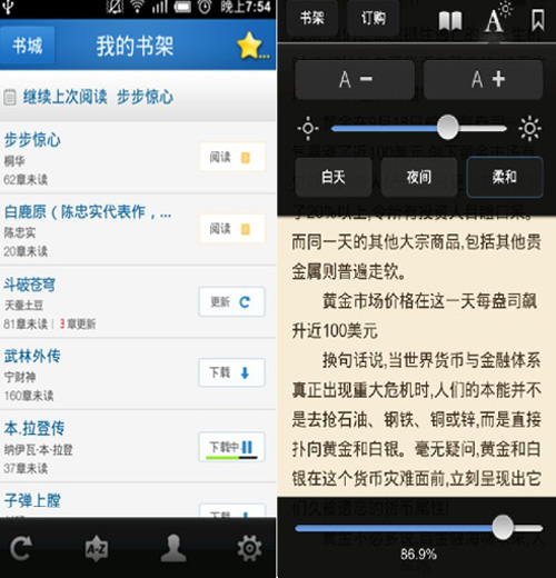 書架部分就是擺放所有你下載的和購買的書籍的地方,在這里如果你在看的電子書有新章節(jié)更新,它會在書架中提示你。閱讀界面支持白天、夜間和柔和三種閱讀模式,適合不同時段閱讀。但是根據(jù)馬勇的介紹,調(diào)整字體的技術(shù)才是這里最大的特點(diǎn),當(dāng)你調(diào)整字體時,相應(yīng)段落之間的間距也會對應(yīng)調(diào)整,不會出現(xiàn)字體變小后文章段落間距很大的問題。