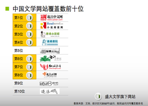 根據(jù)艾瑞咨詢的數(shù)據(jù),中國文學(xué)網(wǎng)站覆蓋人數(shù)最多的前8個文學(xué)網(wǎng)站中,盛大旗下文學(xué)網(wǎng)站占了7個,包括排名第一的起點(diǎn)中文網(wǎng)等。