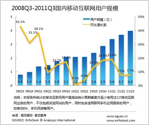 2011第3季度國(guó)內(nèi)移動(dòng)互聯(lián)網(wǎng)用戶規(guī)模接近4億