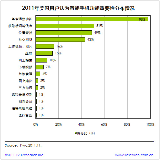 艾瑞咨詢根據(jù)Pwc近日發(fā)布的美國移動(dòng)互聯(lián)網(wǎng)用戶演變研究報(bào)告發(fā)現(xiàn),用戶對(duì)移動(dòng)設(shè)備的使用和依賴程度增強(qiáng),同時(shí),通過對(duì)用戶使用智能手機(jī)功能的調(diào)查發(fā)現(xiàn),用戶認(rèn)為最重要的功能主要集中在基本通信、獲取資訊信息、位置查找和社交網(wǎng)絡(luò)上。