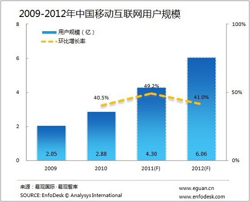 基于EnfoDesk易觀智庫對(duì)移動(dòng)互聯(lián)網(wǎng)的持續(xù)研究,預(yù)計(jì)2012年市場(chǎng)用戶規(guī)模及從移動(dòng)互聯(lián)網(wǎng)市場(chǎng)規(guī)模保持相對(duì)穩(wěn)定的增長(zhǎng),移動(dòng)互聯(lián)網(wǎng)用戶數(shù)有機(jī)會(huì)在2012年突破6億,并且超過互聯(lián)網(wǎng)用戶數(shù)量,智能終端、移動(dòng)互聯(lián)網(wǎng)應(yīng)用繼續(xù)延續(xù)2011年的增長(zhǎng)速度。