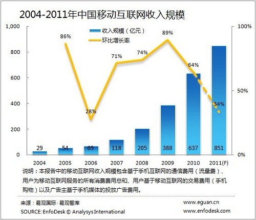 2011年中國(guó)移動(dòng)互聯(lián)網(wǎng)市場(chǎng)規(guī)模達(dá)851億