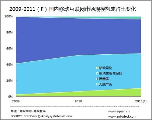 對(duì)比2009年到2011年市場(chǎng)規(guī)模的構(gòu)成變化可以了解到,2011年移動(dòng)購(gòu)物與無線廣告在規(guī)模占比上都有了很大的提高,尤其是移動(dòng)購(gòu)物,從2009年的規(guī)模占比3%增長(zhǎng)到11%,用戶對(duì)通過移動(dòng)終端購(gòu)物的習(xí)慣整逐步被得到培養(yǎng),另外值得注意的是2011年移動(dòng)互聯(lián)網(wǎng)流量費(fèi)占比低于50%,已經(jīng)從2009的58%減少至42%。