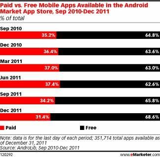 通過(guò)對(duì)2010年9月至2011年12月Android Market應(yīng)用商店的分析,進(jìn)一步表明了對(duì)免費(fèi)應(yīng)用模式的依賴性。根據(jù)第三方應(yīng)用程序跟蹤服務(wù)AndroLib提供的數(shù)據(jù),2010年9月Android Market應(yīng)用商店下載的大約65%應(yīng)用均為免費(fèi)應(yīng)用;在2011年12月,這一比例已經(jīng)提升至69%。