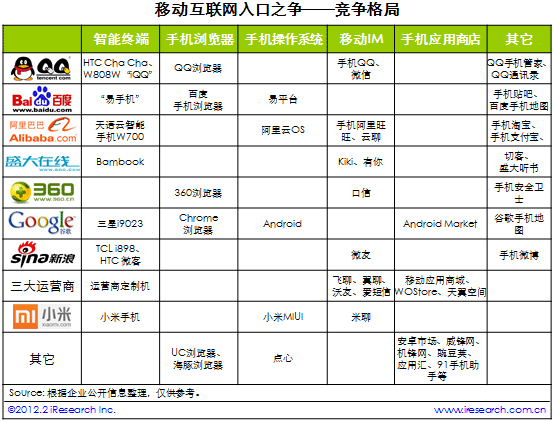 2012年,移動(dòng)互聯(lián)網(wǎng)“入口之爭(zhēng)”仍將繼續(xù),隨著移動(dòng)終端的普及,用戶數(shù)量和流量都將快速增長(zhǎng),各企業(yè)的核心策略仍以用戶數(shù)和流量為主,并在此基礎(chǔ)上開(kāi)始探索商業(yè)模式,并開(kāi)始布局整個(gè)生態(tài)系統(tǒng)?梢灶A(yù)見(jiàn),下一步的競(jìng)爭(zhēng)將蔓延到更具體的應(yīng)用類型上,但是互聯(lián)網(wǎng)企業(yè)的參與度不會(huì)像入口型應(yīng)用這么高,投資和兼并事件將有所增加。