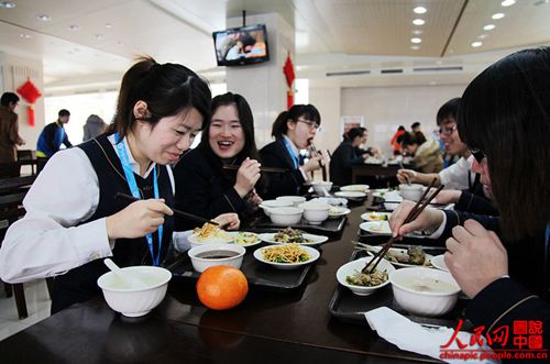 食堂的大樓很霸氣,里面的飯菜也很豐盛,價(jià)格也比外面便宜不少。每人每月有200多元的伙食補(bǔ)貼。若是吃不完卡里的錢,還可以兌換成超市卡。