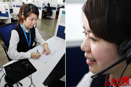 沈青青,今年24歲,湖州人,擔(dān)任浙江移動(dòng)10086接線員已經(jīng)兩年了,是2011年下半年度杭州濱江中心的服務(wù)明星。她每天要接聽至少200-300個(gè)電話,每次她總能以甜美的聲音為顧客解決一個(gè)又一個(gè)的問題。