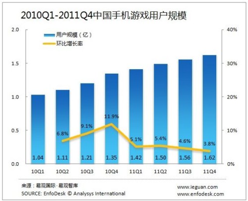 2011年第4季度手機(jī)游戲市場(chǎng)收入11億元