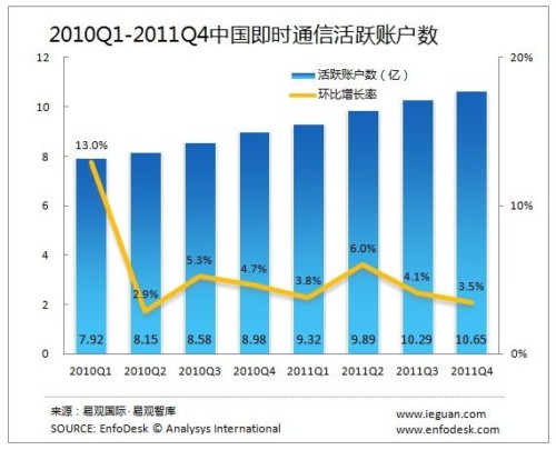 CTI論壇(ctiforum)3月23日消息(記者 潘婷婷): 根據(jù)EnfoDesk易觀智庫發(fā)布的《2011年第4季度中國即時通信市場季度監(jiān)測》數(shù)據(jù)顯示,截止到2011年底,中國即時通信活躍賬戶數(shù)達(dá)到10.65億,環(huán)比增長3.5%,同比增長18.62%。
