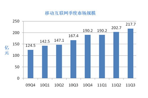 上圖是易觀國(guó)際發(fā)布的移動(dòng)互聯(lián)網(wǎng)的相關(guān)數(shù)據(jù),數(shù)據(jù)截止到2011年第三季度,該圖顯示,2009年全球經(jīng)濟(jì)復(fù)蘇之后,移動(dòng)互聯(lián)網(wǎng)業(yè)務(wù)收入一直保持著良好的增長(zhǎng)狀態(tài),最新數(shù)據(jù)表明,2011年移動(dòng)互聯(lián)網(wǎng)的整體市場(chǎng)規(guī)模已達(dá)到851億,遠(yuǎn)超過(guò)2010年的637億,增長(zhǎng)率將近33.6%,在移動(dòng)互聯(lián)網(wǎng)業(yè)務(wù)子領(lǐng)域中,表現(xiàn)最突出的是移動(dòng)電子商務(wù),與2009年相比較,移動(dòng)電子商務(wù)所占比例由3%直線增長(zhǎng)到11%。但是在手機(jī)閱讀和手機(jī)游戲方面則表現(xiàn)平平,有較大的增長(zhǎng)空間。預(yù)計(jì)2012年3G用戶(hù)規(guī)模將增長(zhǎng)到6億,將會(huì)超過(guò)互聯(lián)網(wǎng)用戶(hù)數(shù)量,智能機(jī)以及移動(dòng)互聯(lián)網(wǎng)還會(huì)保持或者超過(guò)2011年的增長(zhǎng)速率。