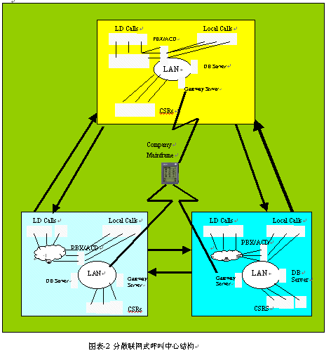。。建立內(nèi)部專用網(wǎng)的目的是有效地實(shí)現(xiàn)各呼叫中心之間的同級(jí)來話路由,使來話的語音信息和數(shù)據(jù)信息能在各個(gè)呼叫中心之間流轉(zhuǎn)。通常情況下,這種形式的呼叫中心可以以一種預(yù)先確定的標(biāo)準(zhǔn),有效地分配溢出的來話。這一類型的來話路由分配在虛擬呼叫中心中則沒有被考慮進(jìn)去。
