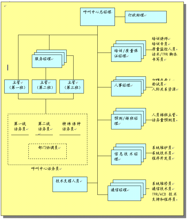 呼叫中心組織結(jié)構(gòu)概述了中心的任務(wù)和職責。對組織進行了統(tǒng)籌安排以便中心能有效達到工作目標,組織安排主要有: