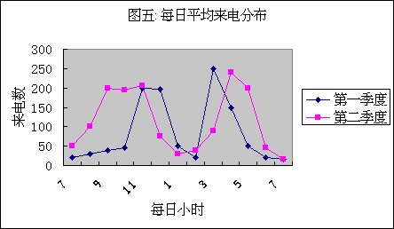 圖五中我們可以看到平均每小時來電量。比較前一季度與后一季度,我們可以看到每天中來電分布的形態(tài)有很大變化。根據(jù)來電的變化來合理安排座席代表班次,才能保證服務(wù)質(zhì)量不受影響。圖四中客戶放棄率的下降可以部分地說明排班調(diào)整的有效性。