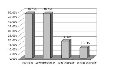 在用戶如何實(shí)施CRM系統(tǒng)的調(diào)查中,已應(yīng)用CRM的單位一般都是由自己或軟件提供商負(fù)責(zé),而沒(méi)用CRM的企業(yè)則大多期望能由軟件提供商負(fù)責(zé)。這說(shuō)明,用戶實(shí)施CRM的主體意識(shí)還不夠強(qiáng)。