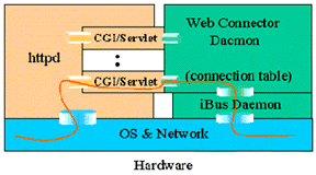 所有來自客戶端的請求(瀏覽器和Applet)都首先發(fā)送給Web Server(HTTP Daemon),然后由httpd啟動相應(yīng)的CGI/servlet擴展,CGI/servlet模塊僅對上傳的數(shù)據(jù)進行簡單的檢查和打包工作然后就傳給Web Connector Daemon,CGI/servlet模塊本身并不處理連接,它是以一種無連接的方式轉(zhuǎn)發(fā)一個請求再回送應(yīng)答。連接的維持和記錄由Web Connector Daemon建立起連接記錄表來完成。