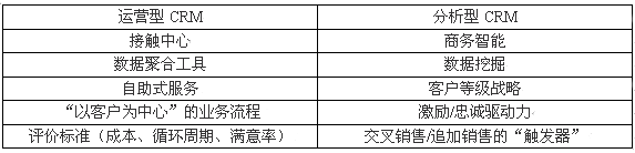 一般情況下CRM的可分為兩大類(lèi):即運(yùn)營(yíng)型CRM和分析型CRM。(有時(shí)把"協(xié)作型CRM"單獨(dú)作為一類(lèi))。多數(shù)情況之下運(yùn)營(yíng)型CRM引用的是產(chǎn)品,服務(wù)和一個(gè)企業(yè)實(shí)際能夠"照料"客戶的運(yùn)做能力。關(guān)系中心,數(shù)據(jù)集合系統(tǒng)及Web站點(diǎn)僅僅是一些例子。分析型CRM主要指用來(lái)推動(dòng)"以客戶為中心"的戰(zhàn)略和工具。商務(wù)智能系統(tǒng),數(shù)據(jù)挖掘工具及客戶層級(jí)戰(zhàn)略都可以算在這個(gè)范疇之內(nèi)。