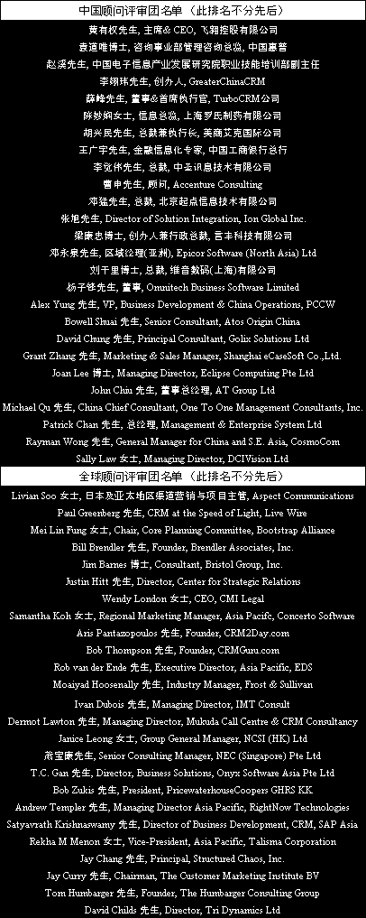 五、 權(quán)威性。GreaterChinaCRM邀請?jiān)摍C(jī)構(gòu)50多位(包括中國和外國)最權(quán)威的CRM專家擔(dān)當(dāng)此次評(píng)選的評(píng)審團(tuán)。