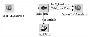 由于不同的源數(shù)據(jù)中可能包含同一個(gè)客戶的信息,因此采用Hashed File Stage HF_khjbxx存放輸出結(jié)果,相同客戶的信息根據(jù)客戶編碼覆蓋前面產(chǎn)生的信息,避免了重復(fù)的客戶信息。從不同源數(shù)據(jù)庫取得客戶信息,根據(jù)數(shù)據(jù)的真實(shí)性依次進(jìn)行處理后,生成的客戶信息全部保存在一個(gè)Hash文件中,最后從Hash文件中取出結(jié)果數(shù)據(jù)裝載到目標(biāo)數(shù)據(jù)庫中。
