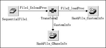 客戶信息數(shù)據(jù)庫中的各表以客戶編碼為關(guān)鍵字進(jìn)行關(guān)聯(lián),客戶編碼是由客戶的證件號(hào)碼經(jīng)過專門的算法計(jì)算產(chǎn)生的唯一客戶標(biāo)識(shí)。根據(jù)各個(gè)系統(tǒng)中客戶數(shù)據(jù)與新系統(tǒng)客戶信息的對(duì)照關(guān)系我們?cè)O(shè)計(jì)數(shù)據(jù)抽取轉(zhuǎn)換的程序,如圖4所示是一個(gè)DataStage的Job。