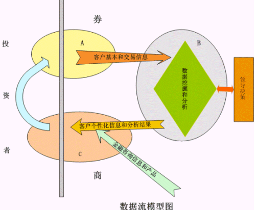 。。在整個(gè)的數(shù)據(jù)流循環(huán)模型中,可以分為三個(gè)模塊:A模塊,客戶通過交易通道進(jìn)行投資活動(dòng);B模塊,根據(jù)客戶的基本信息和交易信息,進(jìn)行大量的數(shù)據(jù)挖掘和數(shù)據(jù)分析,為領(lǐng)導(dǎo)決策進(jìn)行支持,并且得到客戶的個(gè)性化信息和各種分析結(jié)果;C模塊,根據(jù)各種數(shù)據(jù)的分析結(jié)果,同時(shí)根據(jù)投資咨詢師手中現(xiàn)有的信息產(chǎn)品,為客戶提供真正的個(gè)性化的咨詢服務(wù),并且把此個(gè)性化的咨詢服務(wù)即時(shí)傳遞給投資者,為客戶進(jìn)行下一次的投資活動(dòng)而準(zhǔn)備。