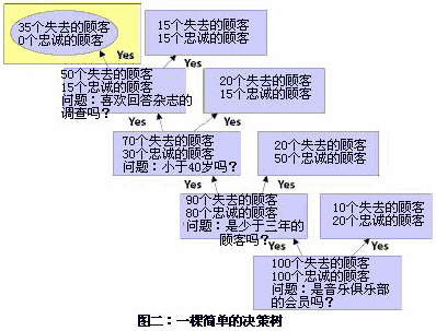 你可以從它的名字中猜到,決策數(shù)是一種樹型分析模型。樹枝代表了用來定義或者細(xì)分客戶的不同問題。比如,假設(shè)一家音樂俱樂部想要分析為什么一些會(huì)員不會(huì)再次申請(qǐng)它的會(huì)員資格(該俱樂部會(huì)員采取月申請(qǐng)制)。為了形成決策樹,公司召集了一批由100個(gè)忠誠(chéng)顧客、100個(gè)非忠誠(chéng)或者已經(jīng)公司已經(jīng)失去的顧客組成的測(cè)試小組。然后,公司開始提出一系列問題,要求顧客形容一下忠誠(chéng)的顧客和非忠誠(chéng)的顧客是什么樣子的。整個(gè)決策樹就如圖二所示。