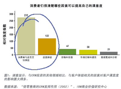IBM商業(yè)價(jià)值研究中心的一項(xiàng)研究結(jié)果印證了筆者的設(shè)想。IBM 對(duì)美國(guó)10家零售商的消費(fèi)群進(jìn)行了調(diào)查,其中包括5家表現(xiàn)較好的(過(guò)去3年中在店面單位面積銷售和凈收入的增長(zhǎng)方面做得很好)和5家表現(xiàn)較差的(業(yè)績(jī)持平或出現(xiàn)下滑)。調(diào)查發(fā)現(xiàn),領(lǐng)先的零售商能夠同時(shí)有效使用關(guān)鍵的滿意度推動(dòng)因素和關(guān)系要素,為消費(fèi)者提供最佳的“總體體驗(yàn)”,即一家公司(或一個(gè)品牌)有形、無(wú)形地給客戶留下的總體印象。該項(xiàng)調(diào)查的統(tǒng)計(jì)分析結(jié)果發(fā)現(xiàn)了5組滿意度推動(dòng)因素: