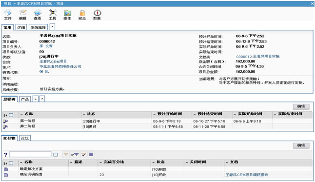 VamCRM提供專業(yè)的項目管理模塊,支持項目范圍管理、時間管理、資源管理、質量管理、成本管理。支持以銷售合約為驅動、過程清晰、全程受控的項目管理方式為客戶交付產(chǎn)品和服務。VamCRM融入成熟的項目管理方法和成功的實踐經(jīng)驗,從整體上對項目進行規(guī)劃、組織、執(zhí)行、控制,使企業(yè)可以更加優(yōu)質地為客戶提供長期的服務。項目創(chuàng)建后,VamCRM系統(tǒng)會自動生成一個與當前項目相匹配的文件夾,為項目執(zhí)行過程中產(chǎn)生的交付物或項目的有關文檔提供統(tǒng)一的存檔位置;項目全程融合項目管理的方法,分里程碑管理項目活動和交付物,實時統(tǒng)計項目的關鍵數(shù)據(jù),并且里程碑及所屬活動和交付物等都可分狀態(tài)量化標識,對項目進展做到實時監(jiān)控,避免了在項目實施中的“救火”行動和盲目發(fā)展。也可自動關聯(lián)記錄并統(tǒng)計所有項目進展過程中發(fā)生的預算與費用,實現(xiàn)項目費用清晰可控。伴隨著項目的進程,可以記錄所有在項目執(zhí)行過程中相關的聯(lián)系人、文檔、備忘錄等數(shù)據(jù),形成完整的項目內容集合。項目中還包括基于項目的論壇,供項目組成員就項目的相關問題進行在線交流,同時,項目管理全程與企業(yè)高效協(xié)同的業(yè)務流程無縫集成,能夠使企業(yè)的相關部門以項目為導向,集中所有資源高效協(xié)同服務,大大降低項目執(zhí)行風險。