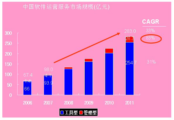2006中國軟件運營服務(SaaS)產(chǎn)業(yè)的規(guī)模為68億元,2011年將突破400億,達到406億元,未來五年的復合增長率達到43%。這是國內(nèi)ICT領(lǐng)域權(quán)威研究機構(gòu)計世資訊(CCW Research)在其最新發(fā)布的《軟件業(yè)的下一個十年——中國軟件運營服務(SaaS)市場發(fā)展趨勢研究報告》中指出的。