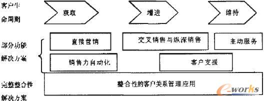 Kalakota and Robinson認(rèn)為,客戶(hù)關(guān)系管理主要包括了三個(gè)不同的階段,分別為獲。ˋcquisition)、增進(jìn)(Enhancement)與維持(Retention)。而這三個(gè)各異的部份,也正和客戶(hù)的不同生命周期階段不謀而合。