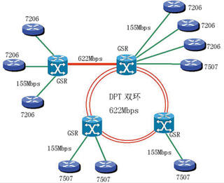 GSR12008是電信營(yíng)運(yùn)級(jí)的高端交換路由器,在這里主干之間用DPT的622Mbps的IP光纖傳輸接口相互兩兩連接成SRP雙環(huán)。