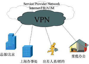 在如圖2所示的VPN 示意圖中,可以看出,VPN所賴(lài)以運(yùn)行的公網(wǎng)平臺(tái)可以包括各種實(shí)際的網(wǎng)絡(luò),例如IP網(wǎng)、幀中繼網(wǎng)、ATM網(wǎng),也可以就是因特網(wǎng)(Internet),因而也表明其網(wǎng)絡(luò)的范圍可以包括多個(gè)服務(wù)商。從地理范圍上看,VPN可以延伸到所有互相聯(lián)網(wǎng)的服務(wù)商所覆蓋的范圍。從用戶(hù)接入方式看,VPN可以包括服務(wù)商所提供的所有接入方式,如專(zhuān)線接入、撥號(hào)接入、無(wú)線連接等。