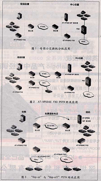 在圖2所示的應用中,遠程局位置直接附加了一個AT-VP504E FXO裝置,為PSTN提供IP電話網(wǎng)關服務,IP語音呼叫被轉(zhuǎn)化為模擬格式通過標準電話線路進行傳輸。同樣,來自普通電話網(wǎng)絡的呼入呼叫,也被轉(zhuǎn)化為IP呼叫通過企業(yè)IP網(wǎng)絡轉(zhuǎn)接。這就使本地PSTN呼叫者,可向企業(yè)或其他目的地打免費長途電話。