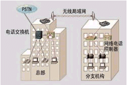 如圖2所示,兩個辦公樓之間距離較遠(yuǎn),不方便布線,其計算機(jī)網(wǎng)絡(luò)可以通過無線局域網(wǎng)來連接。在總部已有電話交換機(jī)系統(tǒng),這時只需在分支機(jī)構(gòu)中增加Cisco網(wǎng)絡(luò)電話控制器,布署IP電話機(jī),然后通過總部帶語音模塊的Cisco路由器或交換機(jī),接入總部的電話交換機(jī),分支機(jī)構(gòu)就可以享用總部的電話中繼線路,與總部一樣自由地使用電話系統(tǒng)。