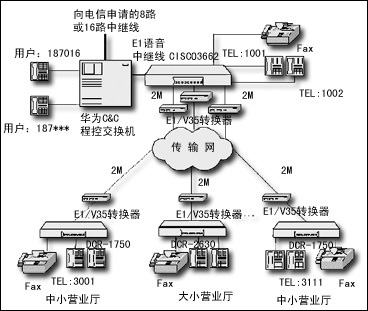 市聯(lián)通通過(guò)在Cisco 3662路由器上配置一個(gè)NM-HDV-1E1-30E語(yǔ)音中繼模塊,通過(guò)75歐姆同軸電纜與華為程控交換機(jī)的E1接口板相連,提供30路話(huà)音,該路由器用作語(yǔ)音網(wǎng)關(guān)。各網(wǎng)點(diǎn)配置神州數(shù)碼路由器,配置MR-VIC-2FXS或MR-NM-4FXS語(yǔ)音模塊,提供多路語(yǔ)音。