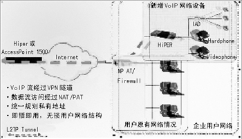 眾所周知,得到了廣泛的商用VoIP協(xié)議之一H.323功能強大,能根據(jù)網(wǎng)絡(luò)的狀況協(xié)商VoIP網(wǎng)關(guān)參數(shù)。但是,H.323協(xié)議的編碼的復雜性和端口的不確定性使得絕大部分NAT/PAT設(shè)備不能處理H.323。然而,基于HiPER的L2TP的VPN解決方案,不僅使話音在一個安全的網(wǎng)絡(luò)中運行,還可以解決由于H.323協(xié)議復雜性帶來的NAT/PAT問題,在不用改造用戶現(xiàn)有的數(shù)據(jù)網(wǎng)絡(luò)的前提下,引進了可以實際使用的VoIP服務,保護了用戶的投資。