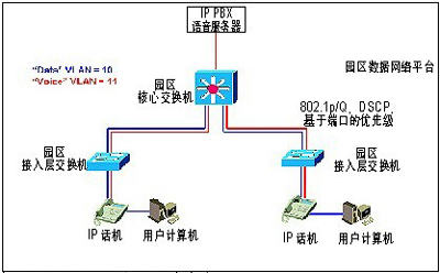 目前各個廠商的系列IP話機(jī)均提供2個以太網(wǎng)端口,一個連接網(wǎng)絡(luò)交換機(jī),一個可以連接用戶PC,與網(wǎng)絡(luò)交換機(jī)連接端口支持802.1Q/p,可以實現(xiàn)IP語音和用戶PC劃歸不同的VLAN,而且IP語音包會帶上第二層和第三層的優(yōu)先級標(biāo)記,可以和客戶具有QoS支持的數(shù)據(jù)網(wǎng)絡(luò)平臺結(jié)合,提高IP話音質(zhì)量。